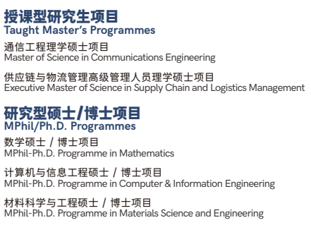 学术夏令营 为增进学生对港中大(深圳)的了解,搭建高校与学生之间的桥梁,促进学术推广和传播,硕士-博士项目于每年7月联合举办学术夏令营,邀请海内外的优秀学子参加,集中安排面试与优先录取。 毕业去向 理工学院硕士博士项目于2019-2020年,毕业学生共计15名。其中,硕士研究生毕业后大多投身于金融、IT和教育等领域;博士研究生毕业后大多继续从事科研工作,其中一名同学赴University College London从事博士后工作。