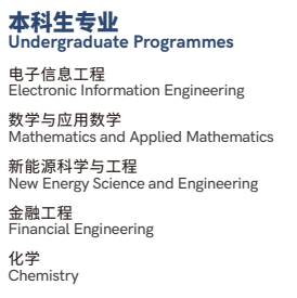 其中,全职教授队伍中,包括: 4 名校长学者 5 名冠名校长讲座教授 8 名校长讲座教授 16 名校长青年学者 至2021年,理工学院共设5个本科专业 数学与应用数学(理论数学方向、应用数学方向、金融数学方向) 电子信息工程(计算机工程方向、电子工程方向) 新能源科学与工程 化学(化学科学方向,材料科学与工程方向) 金融工程(与数据科学学院、经管学院联合创办) 所有本科专业设置注重专业知识的实际应用,旨在培养学生的动手能力和经验积累,并为工程类专业开设毕业设计课程。 在研究生项目上,理工学院目前共设2个授课型研究生项目:通信工程理学硕士专业,供应链与物流管理人员(与经管学院联合开办)